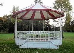 Ein Pavillon ist entweder ein freistehendes, leichtes Bauwerk in einer Garten- oder Parkanlage, ein vorspringender Gebäudeteil eines Bauwerks, der sich durch ein meist als Kuppel ausgebildetes Dach vom restlichen Gebäude abhebt, oder ein kleinerer, einem Hauptbau zugeordneter Neubau (z. B. in Schulen oder Krankenhäusern). Darüber hinaus werden auch Gebäude für Messen und Ausstellungen als Pavillons bezeichnet, unabhängig von ihrer Bauweise.[1] Der Begriff „Pavillon“ stand bis ins 18. Jahrhundert für ein großes, viereckiges (Kriegs-)Zelt; er ist aus dem Französischen entlehnt und stammt letztlich vom lateinischen Wort „papilio“ ab, was im eigentlichen Sinne „Schmetterling“ bedeutet, jedoch schon im Spätlateinischen für ein Zelt steht. Die Übertragung soll daher stammen, dass die umgeschlagenen Enden am Zeltausgang an das Aussehen eines Schmetterlings erinnerten.[2]
