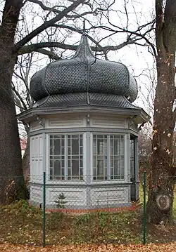 Das aus Holz gefertigte Gartenhaus entstand in der Zeit um 1900. Der Grundriss ist oktogonal, besonders auffällig ist das als Zwiebelhaube gestaltete Dach. Auch die Brüstungen und Fensterflügel sind aufwendig gestaltet.