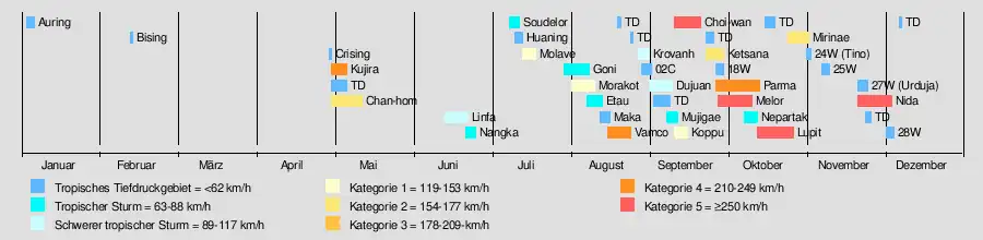 Die Pazifische Taifunsaison 2009 ist die Ansammlung der im Jahr 2009 im westlichen Pazifischen Ozean aufgetretenen tropischen Wirbelstürme. Im Gegensatz zum Atlantischen Ozean und seinen Randmeeren hat die Taifunsaison keine offiziellen Grenzen, sondern ist mit dem Kalenderjahr identisch. Die meisten tropischen Wirbelstürme bilden sich hier jedoch zwischen Mai und November.[1] Tropische Wirbelstürme, die sich nördlich des Äquators und westlich der Datumsgrenze bilden, nennt man Taifune. Die sich östlich des 180. Längengrades bildenden Stürme sind Gegenstand der Pazifischen Hurrikansaison 2009.