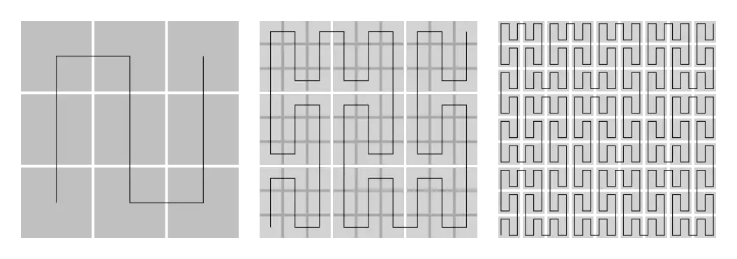 Im zweidimensionalen Fall ist ein Beispiel für eine Peano-Kurve das folgende: Man beginnt mit der Unterteilung eines Quadrats in neun gleich große Quadrate, die in einer S-Kurve durchlaufen werden. Im nächsten Schritt wird jedes dieser Quadrate wieder unterteilt und die entstehenden Quadrate in S-Kurven durchlaufen, die als neue Kurve zusammengehängt werden: