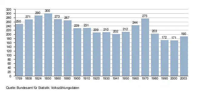 - ↑ Daten der Eidgenössischen Volkszählungen ab 1850 nach Gemeinden. (XLSX; 10 MB) Bundesamt für Statistik, Neuchâtel, 12. Juli 2024, abgerufen am 4. Februar 2025 (Öffnung in Excel nur über "Anhang/Excel-Datensatz" möglich).