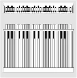 Bei dieser Bauweise gibt es nicht die sonst üblichen länglichen Pedaltasten, sondern runde Knöpfe. Es erinnert eher an die Tastatur eines überdimensionierten einfachen Knopfakkordeons.