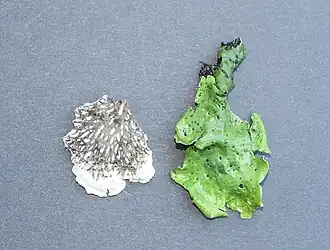 Peltigera leucophlebia, links Unterseite mit deutlichen Adern, rechts feuchte grüne Oberseite (Fundort: Hohe Tauern, Mallnitz) | ||||||||||||
