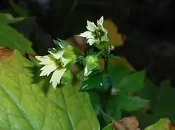 In einem 40 bis 80 cm großen, zymösen Blütenstand stehen über kleinen Tragblättern an Blütenstielen mehrere Blüten. Die Blüten sind zwittrig und fünfzählig mit doppelten Perianth. Die Blütenbecher (Hypanthium) sind mit dem Fruchtknoten verwachsen. Es sind fünf Kelchblätter vorhanden. Die fünf gelblichen Kronblätter besitzen schwach gezähnte Ränder. Es sind zwei Kreise mit je fünf Staubblättern vorhanden. Zwei Fruchtblätter sind zu einem halbunterständigen, zweikammerigen Fruchtknoten verwachsen. Es sind viele Samenanlagen vorhanden. Die zwei Griffel enden jeweils in einer Narbe.