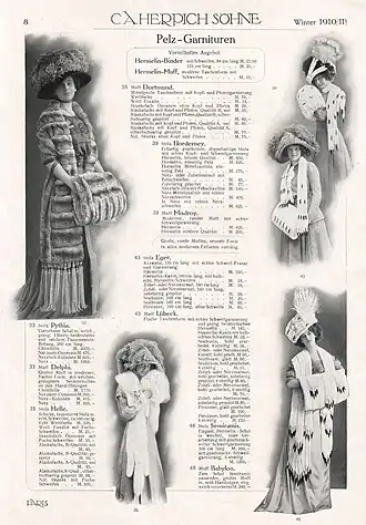 - ↑ a b Alexander Tuma: Pelz-Lexikon. Pelz- und Rauhwarenkunde, Band XX. Alexander Tuma, Wien 1950, Stichworte „Pelzgarnitur“, „Pelzfäustlinge“, „Pelzhut“, „Pelzschuhe“, „Pelztaschen“, „Pelzumhang“.
