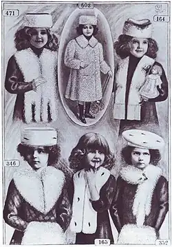 Garnituren für Kinder waren ebenfalls sehr in Mode, nahezu in jedem der Kataloge sind ihnen eine oder mehrere Seiten gewidmet. Immer sind sie aus dem gleichen Fell, oft aus dem, dem Hermelin ähnlichen weißen Kaninfell oder aus dem ebenfalls weißen, gelockten Slink-Lamm und dem langhaarigen weißen oder schwarzgefärbtem Tibet gearbeitet.[4] Weitere Materialien waren Astrachan, Biber, Hase, Opossum, holländisches Schwanenfell, Mongolisches Lamm, Feh oder naturfarbener Marder. Auch diese kleinen Pelze waren, wie die der Mütter, oft mit Schwänzchen und kleinen Aufputzköpfchen ausgeschmückt. Häufiger als bei den Damen gehört eine Mütze zur Mädchengarnitur, für die Allerkleinsten gab es Ohrenschützer, fast immer aus weißem Lamm.[5]