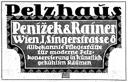 - ↑ Modellwerkstätte für feine Pelzkonfektion. Penižek & Rainer, Pelzhaus, Wien, Prag, Karlsbad (Anzeige 1926).