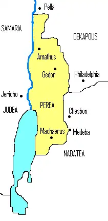 Nach dem Tode Herodes’ im Jahre 4 v. Chr. wurde Peräa bis 39 n. Chr. von Herodes Antipas regiert, der Johannes den Täufer in der Festung Machaerus enthaupten ließ.[7] Von 39–44 n. Chr. regierte Herodes Agrippa I. das Gebiet. Zu dieser Zeit wurde Peräa als Teil des jüdischen Landes betrachtet.[6] Da es zum Passahfest immer wieder zu Spannungen zwischen Juden und Samaritanern kam, zogen viele Juden aus Galiläa es vor, nicht durch Samarien, sondern durch Peräa nach Jerusalem zu reisen.