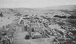 Die obere und mit 150 × 70 Metern zugleich größte Terrasse war ein von Säulenhallen und anderen Gebäuden umgebener Hof, der allein rund 36 Metern × 74 Metern maß. Dieser als Palästra anzusprechende Komplex besaß hinter seiner nördlichen Säulenhalle einen theaterförmigen Unterrichtsraum wohl römischer Zeit und mittig einen großen Festsaal. Weitere Räume unklarer Funktion waren von den Säulenhallen aus zugänglich. Im Westen stand ein nach Süden gerichteter ionischer Antentempel als zentrales Heiligtum des Gymnasions. Der Ostbereich wurde in römischer Zeit durch eine Thermenanlage überbaut. Weitere römische Bäder wurden westlich des ionischen Tempels errichtet.[70]