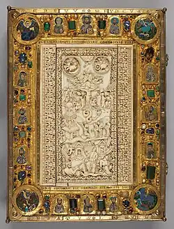 Der gleichfalls wie die Handschrift zwischen 1007 und 1012 entstandene Einband ist der wohl am reichsten geschmückte unter den Prunkhandschriften aus ottonischer Zeit.[9] Er ist vorne im Zentrum mit einer goldgerahmten karolingischen Elfenbeinschnitzerei aus der Hofschule Karls des Kahlen um 870 verziert, welche die Kreuzigungsszene und die Frauen am Grab darstellt.