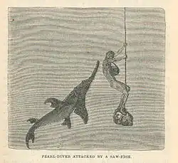 Wie von Heßling beschrieben: Perlentaucher, der auf einem Stein steht, und angreifender Sägefisch (1876)