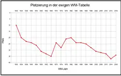 | 18 WM-Spiele 5 Siege 3 Unentschieden 10 Niederlagen 21:33 Tore | |
