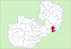 Der Distrikt befindet etwa 320 Kilometer östlich von Lusaka. Er liegt im Süden auf etwa 1000 m und fällt nach Norden auf etwa 900 m ab. Einen Teil der nördlichen Grenze wird von den Luangwa Nebenflüssen Mvuvye und Msanzala, beziehungsweise von den Msanzala Nebenflüssen Singozi und Kalumbi gebildet.