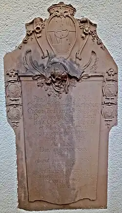 Der Kammerherr wurde bei der benachbarten Pfarrkirche St. Pankratius beigesetzt und erhielt ein Sandstein-Epitaph, das dem Bildhauer Paul Egell zugeschrieben wird. Es zeigt auch die Ahnenwappen des Verstorbenen, wodurch sich seine Abstammung nachvollziehen lässt; links die Wappen Wolkenstein und Madrutz, rechts Altemps und Lante. Als Lebensalter sind 64 Jahre angegeben. Heute ist der Grabstein in die Außenmauer der Kirchensakristei eingelassen.