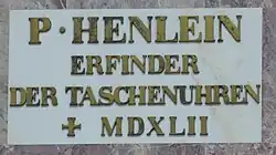 In der Walhalla schließt die Erinnerungstafel mit „P. Henlein Erfinder der Taschenuhren †MDXLII“ die Reihe der 64 Gedenktafeln ab, die im Eröffnungsjahr 1842, auch sein 300. Todesjahr, für jene Personen angebracht wurden, für die keine Porträt-Vorlagen für die Anfertigung von Büsten verfügbar waren.