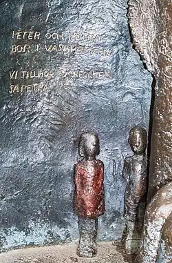 Im Tegnérpark befindet sich eine Skulptur von Astrid Lindgren. Auf Astrid Lindgrens Mantel stehen die Namen von Astrid Lindgrens Büchern, darunter auch Peter und Petra. Das Zwergenpaar Peter und Petra steht unter ihr und schaut sie an.[9]