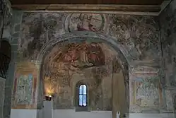 In der Apsis befinden sich Wandmalereien aus zwei Entstehungsphasen. Die oberste Malschicht zeigt zentral die Marienkrönung; die Mutter Gottes wird gekrönt durch die Trinität, worin sich eine eher konservative Haltung zeigt: Diese Darstellungsform war in der Renaissance nicht mehr üblich. Nazarenisch anmutende Stilmerkmale sind vermutlich auf eine Überarbeitung in den Jahren 1849/1850 zurückzuführen.[16] Hinter der Gruppe halten zwei Engel ein schwarzes Tuch. Dahinter befinden sich Wolken und angedeutete Landschaften. Der Hintergrund stammt von der gleichen Hand wie die Mariengruppe. Eine Hieronymus-Darstellung in bogenförmiger Rahmung rechts am Chorbogen wird ebenfalls Mathis Miller zugeschrieben. Links am Chorbogen ist eine Architekturmalerei, eine Säule, zu sehen.[12] Der Meister der Marienkrönung und des Jüngsten Gerichts ist unbekannt, wenngleich für die Marienkrönung eine Autorschaft von Mathis Miller in Erwägung gezogen wird.[16]