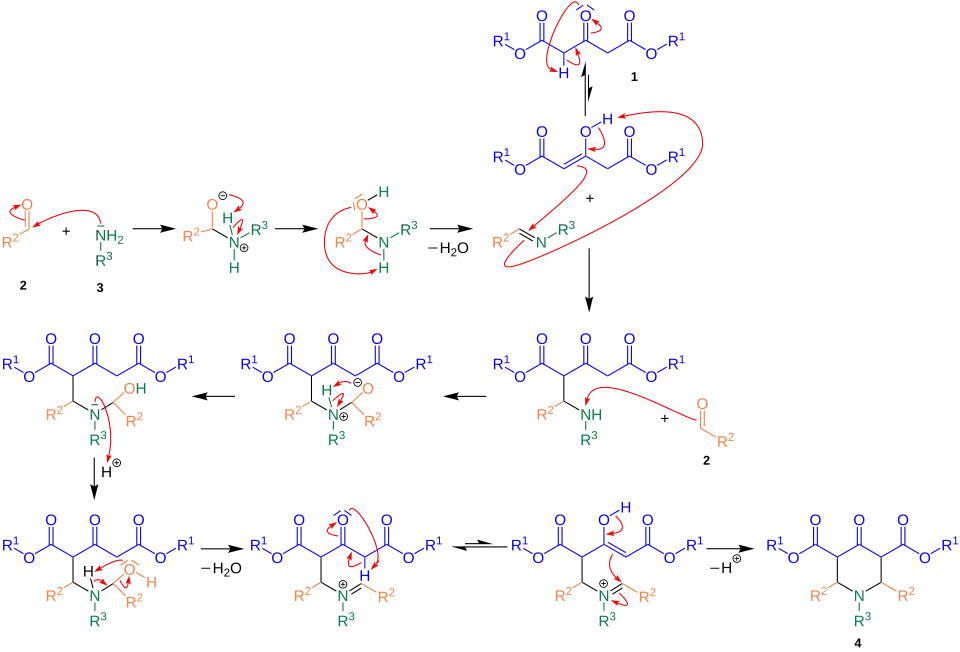 Ein Acetondicarbonsäureester (1) (R1 = CH3, C2H5) reagiert mit einem Aldehyd (2) (R2 = H, Aryl etc.) und einem primären Amin (3) (R3 = Alkyl, Aryl) zu einem Piperidon (4):[2]