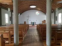 Der moderne Kirchenbau verfügt über ein Satteldach und einen kleinen, über dem Eingang teils hervorstehenden Glockenturm mit Zwiebelhaube. Der weiß gestrichene Innenraum der rechteckigen Saalkirche wird erhellt durch acht Seitenfenster, der Altar durch ein Oberlicht. Das Halbrund der holzverkleideten Gewölbedecke korreliert mit den Holzbänken am Boden und bewirkt einen einladenden Gesamteindruck des Innenraums.