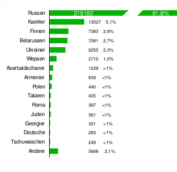 2010 waren 86,7 % der Bevölkerung Russen. Weitere Volksgruppen waren Karelier mit 9889 Personen (4,0 %), Finnen mit 4493 Personen (1,8 %), Belarussen, Ukrainer, finno-ugrische Wepsen, Juden, Roma und andere Nationalitäten.