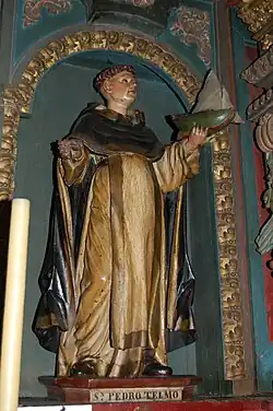 Mit der Zeit vermischte sich die Verehrung von Petrus Gonzales mit derjenigen des eigentlichen Schutzpatrons der Seeleute, des heiligen Erasmus von Antiochia (span. San Telmo), so dass er in Spanien als San Pedro Telmo bekannt ist.[1] Nach ihm sind mehrere Orte benannt, siehe San Telmo.