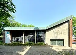 Das auffälligste Element der Kirche ist der 28 m hohe eigenwillig gestaltete Turm.[4] Der Haupteingang befindet sich auf der Westseite und zeigt mit dem Betonrelief im Giebel und der Gestaltung der Türen zwei stilisierte Darstellungen. Das Bronzerelief auf der Tür zeigt die Schöpfungsgeschichte, das Betonrelief im Giebel das Lamm Gottes.[4] Beide Reliefs stammen von der Künstlerin Nanette Lehmann.