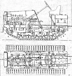 Das Fahrgestell hatte auf jeder Seite 5 Laufrollen, die Führungsrolle war vorne, die Antriebsrolle hinten. Der Vierzylindermotor (Bohrung × Hub 100 × 150 mm) war mit dem der gleichzeitig gebauten LKW Peugeot 1515 und Peugeot 1525 identisch. Der Motor leistete 38 PS bei 1200/min. Für die sechsköpfige Bedienung des Geschützes gab es Sitze links und rechts auf der Motorhaube. Auf feuchtem Boden sanken Geschütz und Protze leicht ein, der Schutzschild des Geschützes wirkte dann bremsend[5]. Die Höchstgeschwindigkeit in den einzelnen Gängen betrug: 1. Gang 2,2 km/h, 2. Gang 4,0 km/h und im 3. Gang 6,7 km/h.[6]