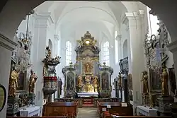 Ein Marienaltar mit Brustbildern der Vierzehn Nothelfer aus dem zweiten Drittel des 18. Jahrhunderts, das Grabmal des im Jahre 1671 verstorbenen Pfarrers Anton Balster und seine Büste befinden sich im linken Seitengang.
