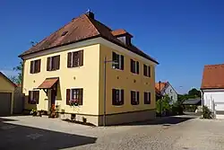 Der zweigeschossige, verputzte Massivbau mit Walmdach und Stuckrosetten besitzt drei zu drei Fensterachsen.
