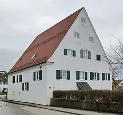 Der zweigeschossige Steilsatteldachbau mit verkröpftem Giebelgesims besitzt vier zu fünf Fensterachsen. Als Gliederungselemente dienen ein verkröpftes Trauf- und ein Giebelgesims. Die nördliche Giebelseite hat eine Ladeluke im ersten der drei Dachgeschosse. Der Hauseingang liegt an der nördlichen Giebelseite.