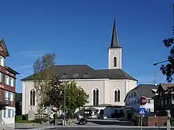 Innen die Kirche ein Saalraum mit einer Flachdecke über einem umlaufenden Gesims. Die Langhauswände sind mit gekoppelten Rundbogenfenstern und breiten Wandpilastern gegliedert. Die Stuckkartuschen sind gemalt, ebenso wie die Kapitelle und die Fensterbekrönung. Ein eingezogener und runder Chorbogen trennt das Langhaus vom eingezogenen 5/8-Chor mit Flachdecke über einem umlaufenden Gesims. In der Stirnwand befinden sich gekoppelte Rundbogenfenster und ein Kreisfenster.