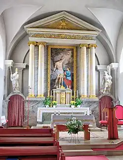 Die Stichkappentonne des vierjochigen Langhauses ruht auf Wandpfeilern mit stark profiliertem Gebälk. Darunter erheben sich ein eingezogener, rundbogiger Triumphbogen und im Westen, auf zwei toskanischen Säulen, eine kreuzgratunterwölbte Orgelempore. Der zweijochige Chor ist gedeckt durch eine Stichkappentonne mit Gurtbögen auf Pilastern und stark profiliertem Gebälk. An der Ostwand befinden sich Schildbögen. In Rundbögen sind die östliche und die westliche Seitenkapelle zum Langhaus geöffnet. Sie sind durch Kreuzgratgewölbe auf Pilastern gedeckt.