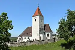 Die Kirche steht hoch über dem Ort und ist von einem Friedhof umgeben. Der romanische Kirchenbau wurde mit dem südlichen Seitenschiff gotisch erweitert. Der romanische Chor erhielt einen gotischen Fünfachtelschluss. Der Südturm am Chor ist ein massiver mittelalterlicher Wehrturm.