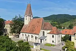 Das Kircheninnere zeigt eine dreischiffige spätgotische Staffelhalle, mit einem nach dem eingestellten Turm dreijochigen Parallelnetzrippengewölbe, die niedrigen vierjochigen Seitenschiffe über Oktogonalpfeilern anlaufend sind mit Spitzbogen zum Langhaus geöffnet, die großteils original erhaltene spätgotische Fugenmalerei bestimmt den Gesamteindruck mit. Das westliche Mittelschiffjoch nimmt der Turm ein, das Turmerdgeschoß ist tonnengewölbt. Die einjochige netzrippenunterwölbte Orgelempore ist nur dem Turm vorgestellt und zeigt in der Brüstung spätgotisches Blendmaßwerk in Kiel- und Rundbogenformen. Der Turm zeigt im zweiten Geschoß südseitig ein vermauertes Rundbogenportal, im dritten Geschoß im Norden und Süden vermauerte Rundbogenfenster, im vierten Geschoß allseitig gekuppelte Rundbogenfenster mit Putzrahmung. Das östliche fünfte Langhausjoch vor dem Chor zeigt Hängekuppeln auf Pilastern nach 1770.