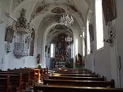 Das Innere ist im Langhaus und Chor mit flachen, lisenenartigen Pilastern mit Rücklagen gegliedert, das westlichste Joch ist gegen Süden etwas verbreitert. Das Langhaus ist mit einem Tonnengewölbe mit Stichkappen versehen, Chor mit einem Tonnengewölbe und einer Konche mit Stichkappen. Das Langhaus und der leicht aus der Achse gerückte Chor sind durch eine barocke Triumphbogenwand getrennt. Die barocke Stuckdekoration an Wänden und Decke stammt von Anton Gigl von 1737. Die Deckenmalereien wurden 1930/31 von Franz Singer geschaffen. Der Raum wird durch Rundbogenfenster mit schräg geschnittenen Laibungen und mehrfach profilierter, zarter Stuckrahmung an der Südseite des Langhauses und im Chor belichtet.