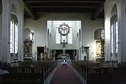 Der dreischiffige Kirchenbau hat ein überhöhtes Chorquadrat und einen Westturm.