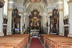 Das Kircheninnere zeigt ein einschiffiges dreijochiges Langhaus mit einem schmalen Joch vorne und hinten mit abgerundeten Ecken, mit einem Tonnengewölbe mit Stichkappen auf Wandpfeiler mit Pilastern, mit Voluten und Girlandenmotiven. Der Chorbogen ist rundbogig. Der eingezogene zweijochige Chor hat einen geraden Schluss mit abgerundeten Ecken, ein Tonnengewölbe mit Stichkappen auf Pilastern. Im ganzen Innenraum gibt es ein umlaufendes kräftiges Zahnschnittgesims, durch die Fenster unterbrochen. Die Fenster haben einen unterbrochenen Konvexbogen als Abschluss. Die Empore steht auf Säulen und ist über zwei gewendelte Treppen erreichbar, die geschwungene Brüstung zeigt ein Girlandenornament.