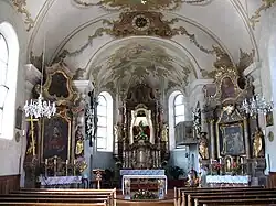 Den Hochaltar um 1800 schuf Anton Bichler, er zeigt das Hochaltarbild hl. Johannes Nepomuk gemalt von Franz Nikolaus Streicher, er trägt die Statuen Peter und Paul und zeigt im Auszugsbild den Schutzengel Raphael. Die Seitenaltäre sind aus dem dritten Viertel des 18. Jahrhunderts, links mit dem Bild Mariahilf und den Statuen Helena und Notburga, rechts mit dem Bild hl. Sebastian und den Statuen Rochus und Johannes Evangelist.