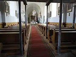 Das Kircheninnere zeigt sich mit einem vierjochigen Langhaus mit Kreuzgratgewölben über Wandpfeilern mit einer halbkreisförmigen Apsis. Die Westempore ist aus Holz.
