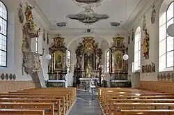 Der Hochaltar und die zwei Seitenaltäre zeigen Bilder von Josef Reich (1900).