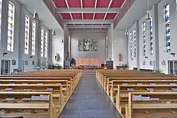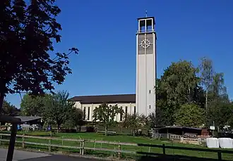 Der Kirchenbau ist ein Saalbau mit flachem Satteldach. Die Fassade und die Seitenwände sind durch Lisenen gegliedert. Der Kirchturm im Südosten ist freistehend. Westlich schließt das Pfarrzentrum an.