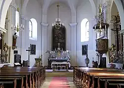 Das vierjochige Langhaus unter einem Tonnengewölbe mit Stichkappen steht auf Pilastern. Die dreiachsige Westempore über einem Kreuzgratgewölbe steht auf Säulen. In der vorgewölbten Emporenbrüstung ist eine Nischenfigur hl. Rosalia. Am östlichen Langhausjoch ist die Kirche beidseits mit Altarnischen erweitert. Der Triumphbogen ist rundbogig. Der Chor hat Stichkappen.