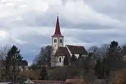 Die Kirche mit Langhaus und Turm hat südlich am Chor einen quadratischen Turm, das Turmportal trägt das Wappen des Georg Siegmund Graf Trauttmansdorff 1679.