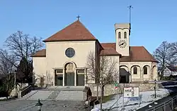 Die Kirche ist ein kubischer Bau über einem kreuzförmigen Grundriss. Der Kirchenbau ist mit einem Walmdach gedeckt. Die Fassade ist schlicht gehalten. Das Südportal ist dreiteilig. In der darüberliegenden Lünette ist ein Steinrelief des heiligen Johannes der Täufer von Rudolf Schmidt. Darüber ist ein großes Rundbogenfenster. Im Osten liegt der ehemalige Polygonalchor. Die gotischen Strebepfeiler sind durch rundbogige Verschleifungen zu Nischen miteinander verbunden worden. In diesen Nischen sind Rundbogenfenster. Zwischen Langhaus und Chor steht über dem ehemalig romanischen Chorquadrat der 1956 wiedererrichtete Kirchturm. Die Schallfenster sind rundbogig und der Turm schließt nach oben hin gerade ab. Darauf ist ein Umgang mit Brüstung auf Kragsteinen. Im Norden der Kirche ist die Sakristei angebaut.
