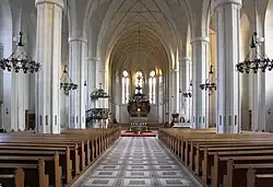Die neugotische Hallenkirche aus Backstein hat ein Langhaus mit quer gestellten Giebeldächern über den Seitenschiffen und einem etwas niedrigeren eingezogenen Chor, der durch Strebepfeiler und zwei- bis vierbahnige Spitzbogenfenster gegliedert ist. Seitlich des Chores befinden sich zweigeschoßige Anbauten und überkuppelte Treppentürmchen. Die nordwestliche Giebelfront ist von überkuppelten Treppentürmchen flankiert; vorangestellt ist der mächtige Turm mit offener Vorhalle und achtkantigem Spitzhelm.