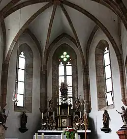 Das Kircheninnere zeigt ein zweijochiges gotisches Langhaus mit Kreuzrippengewölben mit Gurten auf Runddiensten und runden Schlusssteinen. Im nördlichen Joch steht eine Empore aus Holz vom Tischler Wolf Hofler 1687, die Brüstung zeigt Apostelbilder. Der abgefaste Triumphbogen ist spitzbogig. Der gotische Chor mit einem Fünfachtelschluss hat ein Kreuzrippengewölbe auf Konsolen mit Wülsten, die drei Spitzbogenfenster haben teils einen gotischen Maßwerkansatz. Im mittigen Chorfenster ist eine Glasmalerei mit dem Kopf Christi aus der ersten Hälfte des 15. Jahrhunderts zu sehen, die 2001 in den Werkstätten des Bundesdenkmalamtes restauriert und mit einer Außenschutzverglasung versehen wurde.[1] In der Westwand befindet sich ein abgefastes rundbogiges Sakristeiportal mit einer Eisenplattentür. Die spitzbogig geöffnete Turmhalle hat ein flaches Kreuzgratgewölbe.