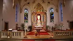 Der barocke Hochaltar steht auf einem Sockel und stammt aus der Territorialabtei Wettingen-Mehrerau in Bregenz.[13] Das Altarbild wird von sechs Säulen flankiert. Das Altarbild wird je nach Zeit im Kirchenjahr ausgewechselt.[5] Der Hauptaltar wird von einem Oberbild dominiert, welches Gottvater und Heiliger Geist darstellt (gemalt von Josef Wiedemann, 1895). Der Tabernakel besteht aus weißem Marmor und wurde von Maximilian Schmalzl geplant und 1895 eingebaut.