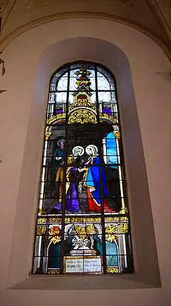 Die Glasgemälde aus dem Jahr 1898 beidseitig des Hochaltars zeigen links die „Verkündigung des Herrn“ und rechts die „Heimsuchung“ der Gottesmutter Maria.[14]