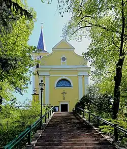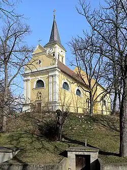 Stilistisch ist der Kirchenbau dem Klassizismus zuzuordnen. Es handelt sich um einen verputzten Ziegelbau, der mit Eckrustika und Stockwerksbändern versehen ist, und eine schlichte spätklassizistische Volutengiebelfassade mit Doppelpilastern und einem großen, zentralen Lunettenfenster besitzt. Im Norden steht ein Sakristeianbau. Der dreigeschoßige Nordturm ist im Kern romanisch und mit Eckquaderung, Doppelschallfenstern und Spitzhelm verziert. Er wurde Mitte des 19. Jahrhunderts erbaut.