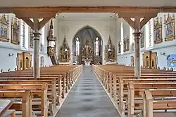 Die Inneneinrichtung ist aus den Jahren 1893 bis 1894. Hochaltar und Seitenaltäre sind vom Bildhauer August Valentin, die Figuren der Seitenaltäre von Bildhauer Alois Reich, die Kanzel vom Bildhauer Moriz Schlachter.
